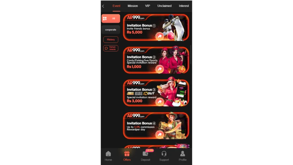 The AR999 app offers a wide range of gaming categories. Each section provides unique earning possibilities. Therefore, players never feel bored: