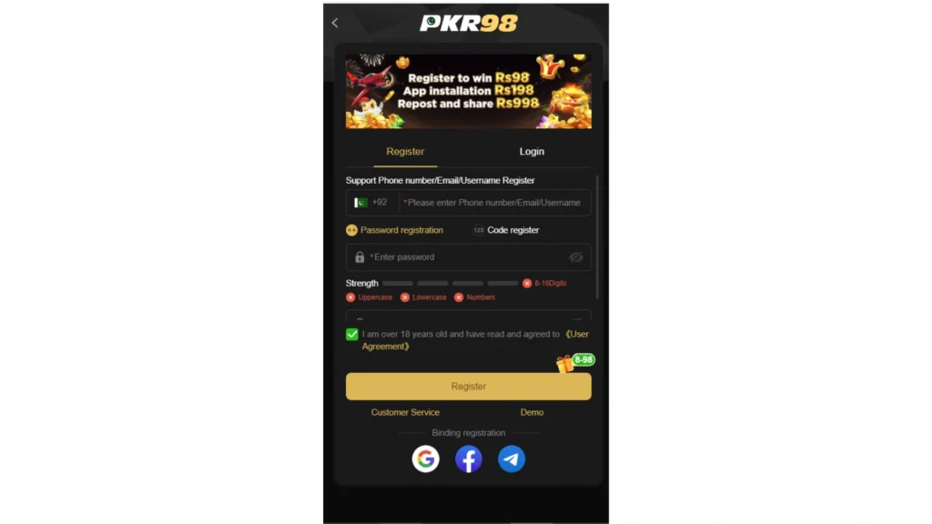 You now complete your PKR98 Game Register process. After your login, you can explore games, deposit funds, and start playing.